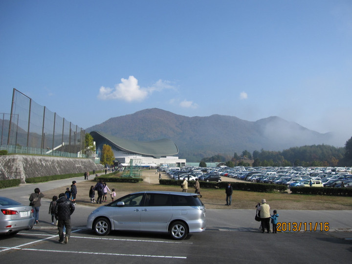下の写真は会場の駐車場と周囲の山々(右は龍頭山: 標高928m)。