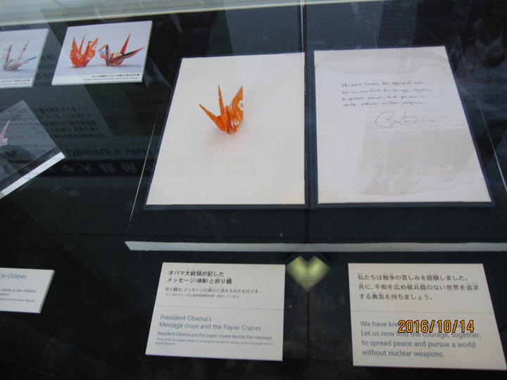 順路に従って原爆の被害の状況に関する各種展示を見ながら進むと、最後のコーナにオバマ大統領の折り鶴がありました。
