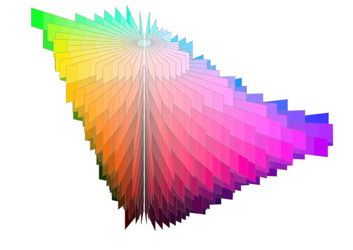 下図は、各種の色を正確に表示することを目的としたマンセル表色系の色立体の例です(色相数 40)。