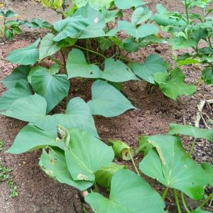安納芋というサツマイモらしいのですが、残っていた1本から芽が出ていたので、6月末にその部分を切り取り、庭の片隅に植えました。
