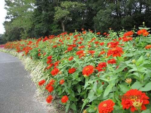 花の広場にはコスモスや百日草(ジニア)、ケイトウなどが咲き誇ていました。