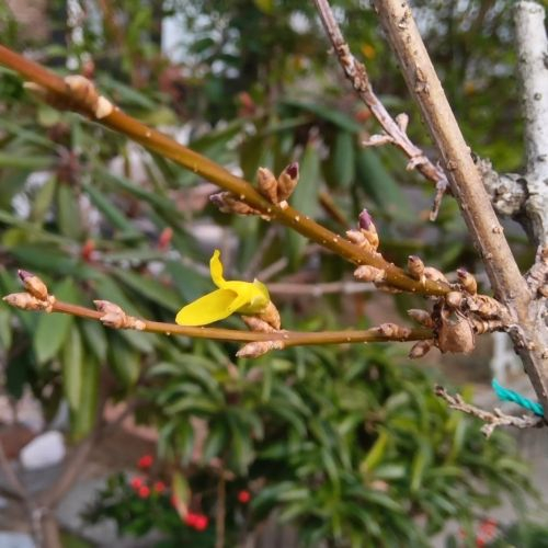 庭のレンギョウに花一輪 早春の3~4月頃に咲くレンギョウ(連翹)。 どうしたことか、まだ1月半ばというのに庭の片隅にあるレンギョウに黄色の花が一輪咲いています。 ロウバイも今年はいっぱい蕾を付け、今にも咲きそうです。 « 前の記事 次の記事 » コメント(0)