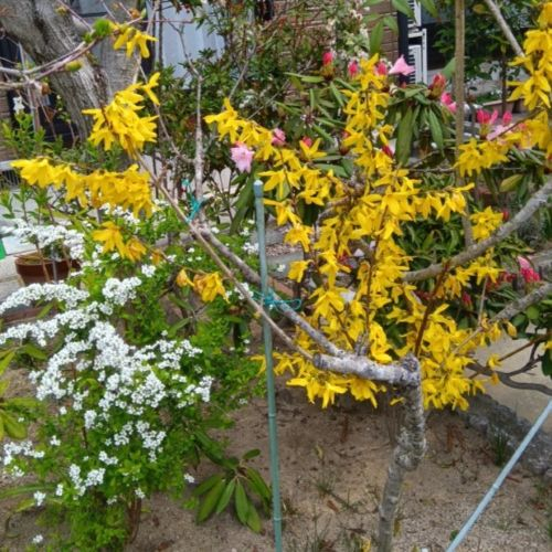 庭のシャクナゲやレンギョウ、ユキヤナギの花が一斉に咲いていてきれいです。
