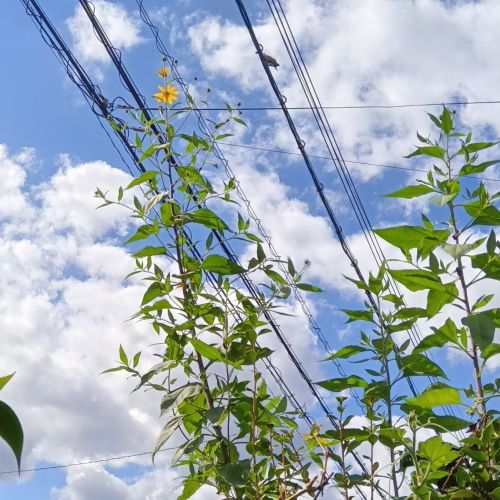 先日、3mほどに伸びた茎の先端に黄色い花が咲いているのを見つけました。