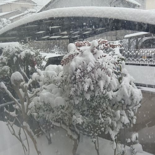 安佐南区ではご覧のように、庭の木々や車庫の屋根の上にもかなりの積雪となっています。