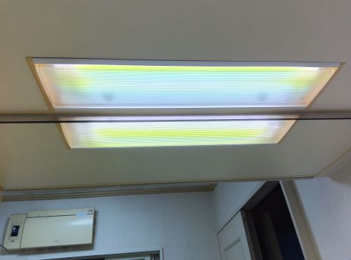 洗面所には天井にLED照明が付いていますが、これだけでは洗面、整髪時などは少し暗く、洗面台上の蛍光灯を併せて点灯していました。