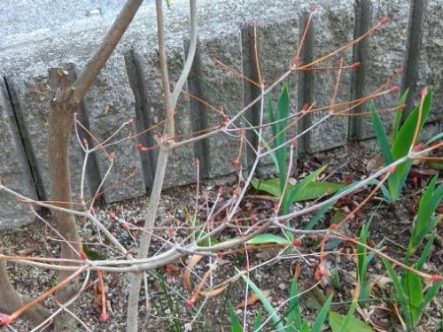 庭のドウダンツツジの枝の先端が赤く膨らんできました。